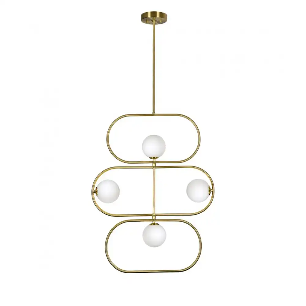 The “Deco Cascade” pendant features a unique, vertically stacked design composed of three interconnected, elongated oval frames. Within these frames, four luminous opaline glass globe shades are strategically positioned – one in the top oval, two in the middle, and one in the bottom. These spherical shades provide a soft, diffused, and inviting glow, creating an atmosphere of elegant tranquility. The combination of the rich brushed gold finish and the milky white opaline glass globes offers a visually stunning contrast and ensures broad, even light distribution, making it an ideal centerpiece for dining rooms, living areas, or grand entryways.