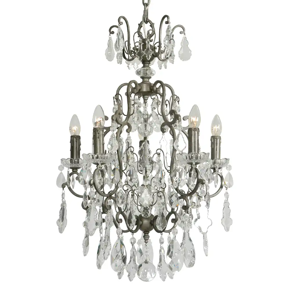 This 5-light chandelier combines timeless elegance with refined craftsmanship, making it an exquisite statement piece for sophisticated interiors. The frame is crafted from high-strength metal with a hand-applied antique pewter finish, subtly distressed to highlight its ornamental scrollwork while ensuring long-lasting durability.