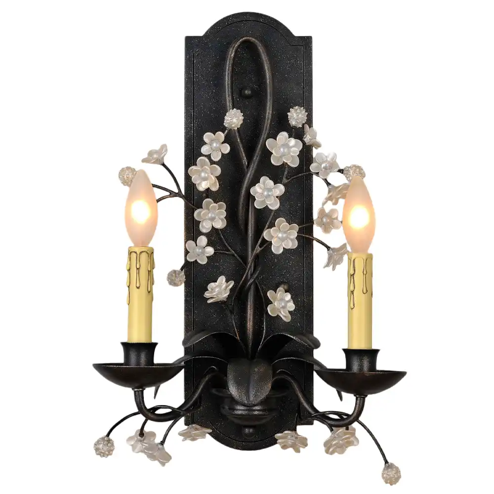 This two-light wall sconce is constructed from robust, high-strength metal, ensuring a stable structure that is built to withstand time and provide long-term compatibility. The distinguished hand-applied distressed iron finish offers a deep, textured appearance with warm, earthy tones and a sense of aged history, beautifully contrasting with the delicate crystal flowers. This durable finish, combined with the elegant rectangular backplate with sculpted leaf details, a graceful central metal vine, two prominent faux candle covers with drip details (bulbs not included), and a profusion of delicate clear crystal flowers and buds along winding metal branches, creates an artistic and powerful presence. The faux candle covers provide a traditional, cozy ambiance without the need for real candles, while the crystal floral accents add a dazzling, shimmering touch, enhancing a magical and stylish atmosphere with refined elegance.