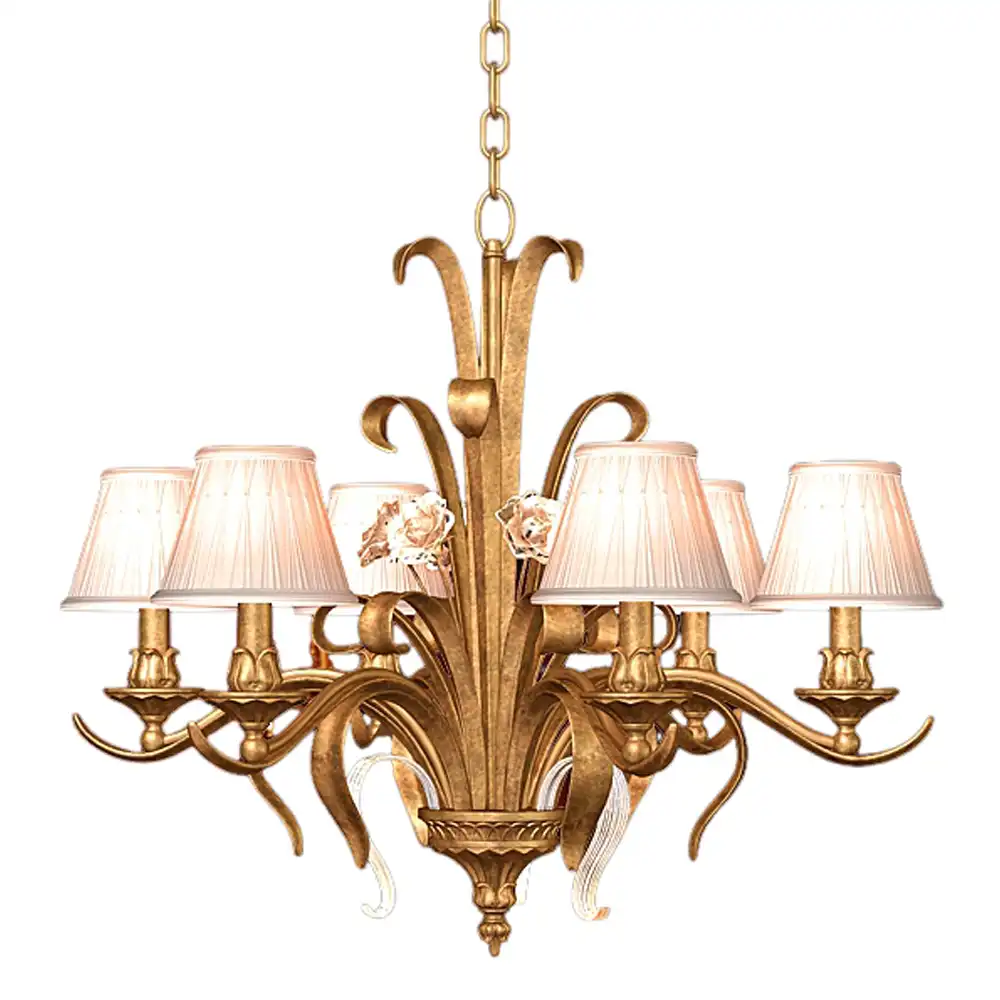 The Fiorenza 6-Light Chandelier embodies timeless European luxury with a modern handcrafted touch. Constructed from premium high-strength metal, the fixture offers both exceptional durability and artistic refinement. Its frame features a hand-applied Antique Gold Leaf finish, delicately layered with subtle champagne undertones and soft bronze shading, creating a luminous and textured patina that evokes the elegance of traditional gilded decor.