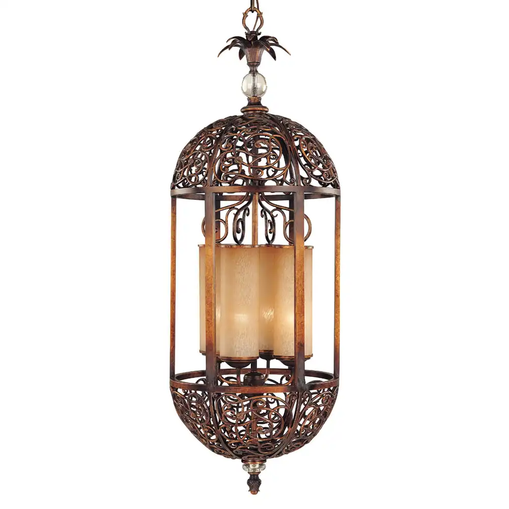 Intricately designed with ornate openwork scroll patterns, the pendant exudes a sense of architectural grace and artistic depth. At its core, four lights are encased within cylindrical antique snow champagne glass shades accented by delicate amber edges, diffusing the light into a warm, atmospheric glow.