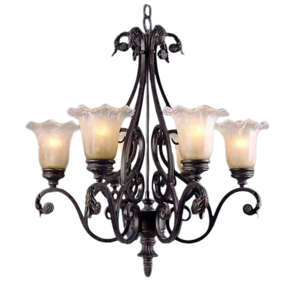 The chandelier is outfitted with six light holders, each cradling a flower-shaped amber scavo glass shade with an artistic uneven upper edge. These petal-inspired shades glow warmly when illuminated, creating a soft and inviting ambiance. Every structural element is engineered from high-strength metal, ensuring durability and stability in long-term use.