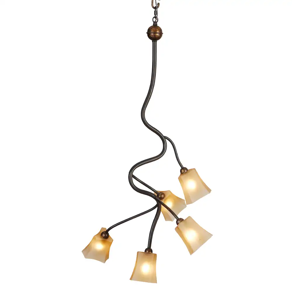 Organic Form & Earthen Finish: The “Forest Bloom” pendant features a captivating deep bronze finish with subtle hand-brushed aged accents on its intricate, vine-like metalwork. The base color is a rich, dark brown, almost black, providing a robust and earthy foundation. Lighter bronze and faint coppery tones are delicately brushed along the undulating curves and branches of the metal structure, highlighting its naturalistic form and giving it a beautifully aged, almost organic patina. This sophisticated finish perfectly complements the five distinct bell-shaped glass shades, which vary subtly in their frosted and amber-toned clarity, evoking the soft glow of blossoming flowers or nascent leaves.