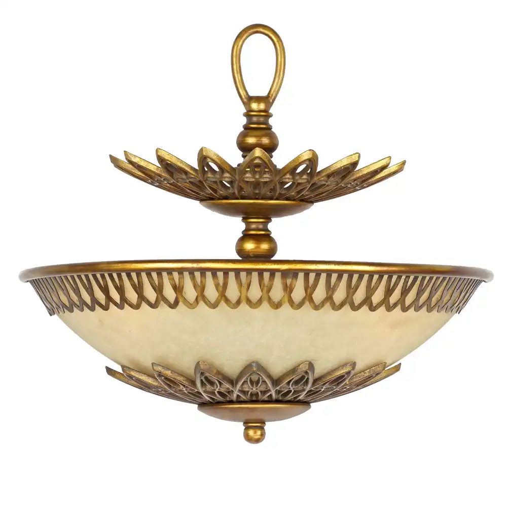 Amber Frosted Glass Shade: Bowl-shaped, adorned with intricate lattice trim and petal embellishments.