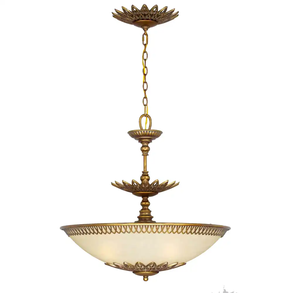 Supporting the light source is an elegantly ornamented amber frosted glass shade. This bowl-shaped lampshade is framed with a delicate openwork lattice pattern along its rim and floral accents at its base. The lampshade is center-locked to the stem, fully enclosing four light holders for a warm, evenly diffused illumination.