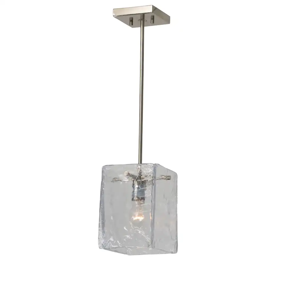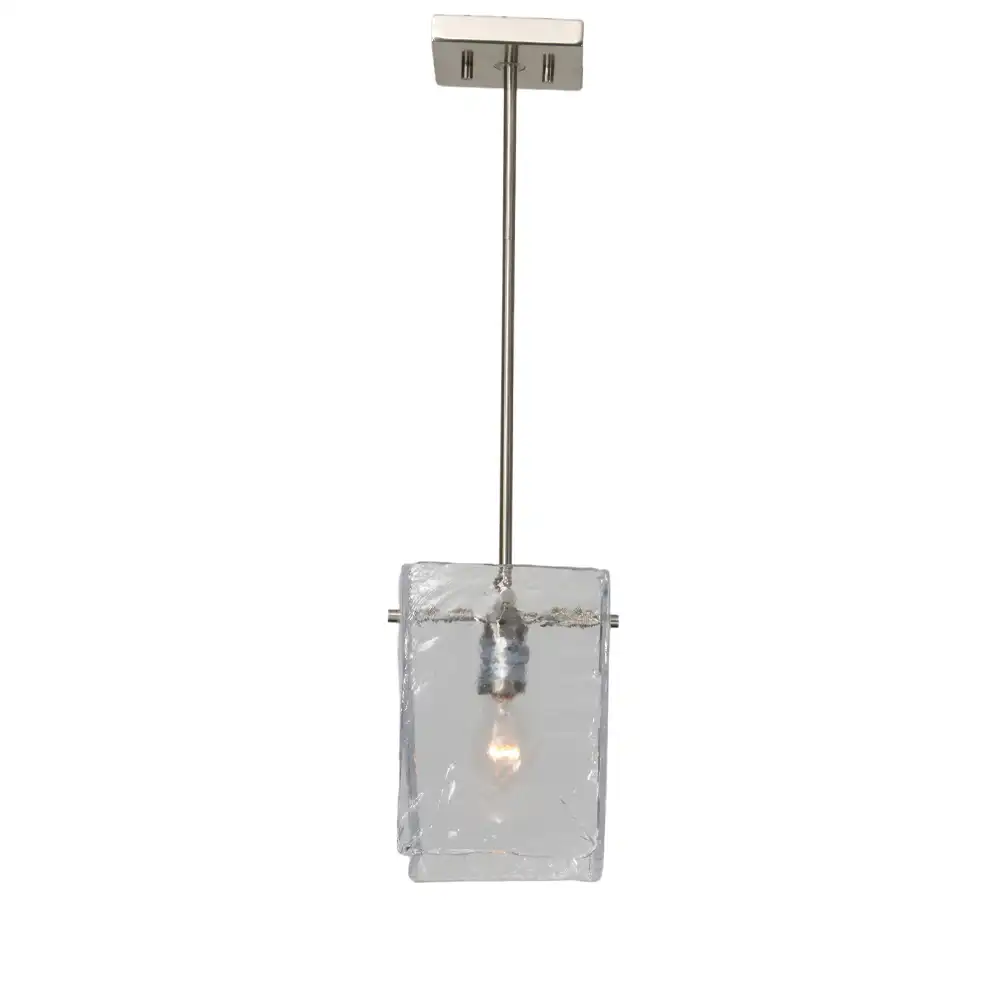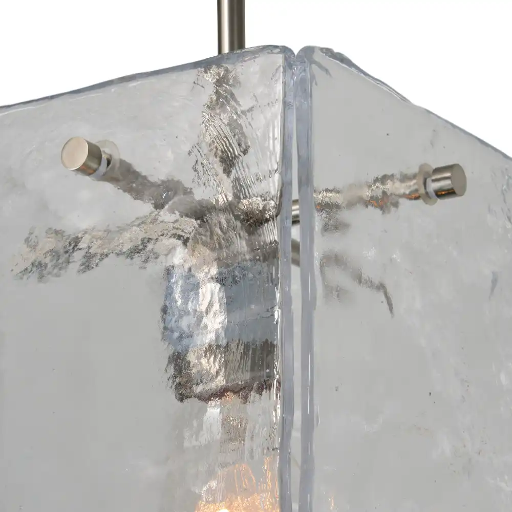 The “Glacial Cube” features a uniquely crafted rectangular shade made from hand-hewn, textured clear glass. This artisanal glass boasts an irregular, almost ice-like surface, giving it a tactile and organic quality. When illuminated, the textured glass diffuses the light beautifully, creating a soft, warm glow while scattering intriguing patterns that add depth and visual interest to the space. The single internal light source is subtly suspended within the glass, allowing the unique character of the material to take center stage. The sleek brushed nickel hardware provides a refined contrast to the organic glass, completing its modern aesthetic.