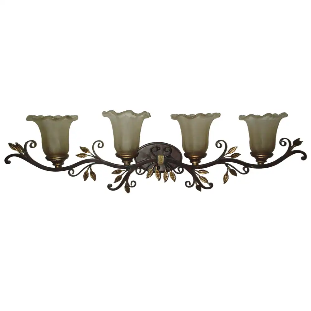 This four-light vanity light is constructed from robust, high-strength metal, ensuring a stable structure that is built to withstand time and provide long-term compatibility. The distinguished hand-applied rustic bronze finish offers a deep, earthy tone that serves as a perfect base for the delicate, hand-applied gilded gold leaf accents on the numerous leaves and central stem, creating a stunning visual contrast. This durable finish, combined with the central ornate oval backplate, the gracefully sculpted horizontal branch-like bar adorned with intricate vine scrollwork and leaf details, and the four prominent frosted, scalloped-edge amber-tinted glass shades, creates an artistic and welcoming presence. The frosted glass, with its delicate scalloped rim and warm amber hue, beautifully diffuses the light (bulbs not included), creating a soft, ambient glow that is perfect for providing ample and glare-free illumination for grooming tasks or enhancing a serene atmosphere.