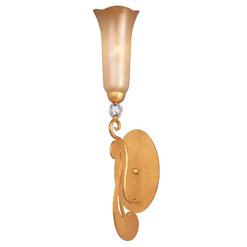 This single-light wall sconce is constructed from robust, high-strength metal, ensuring a stable structure that is built to withstand time and provide long-term compatibility. The distinguished gilded gold leaf finish offers a lustrous, hand-applied gold appearance, providing a luxurious aesthetic that complements classic decor and rich color palettes. This durable finish, combined with the elegant oval backplate, the flowing organic scrollwork, a dazzling clear crystal accent, and the prominent amber fluted glass shade, creates an artistic and powerful presence. The amber-hued, fluted glass beautifully diffuses the light (bulb not included), creating a soft, warm, and inviting ambient glow, while the crystal adds a touch of refined sparkle, perfect for enhancing a sumptuous and elegant atmosphere.