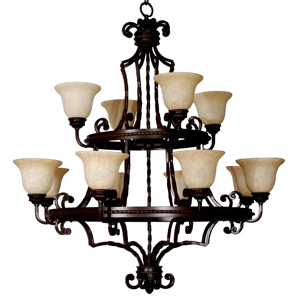 Central to the design are twisted metal stems and decorative scroll accents, adding depth, craftsmanship, and traditional elegance. The two-tier structure provides both grandeur and balanced illumination, making it ideal for hotel lobbies, banquet halls, villas, and large-scale residential interiors.