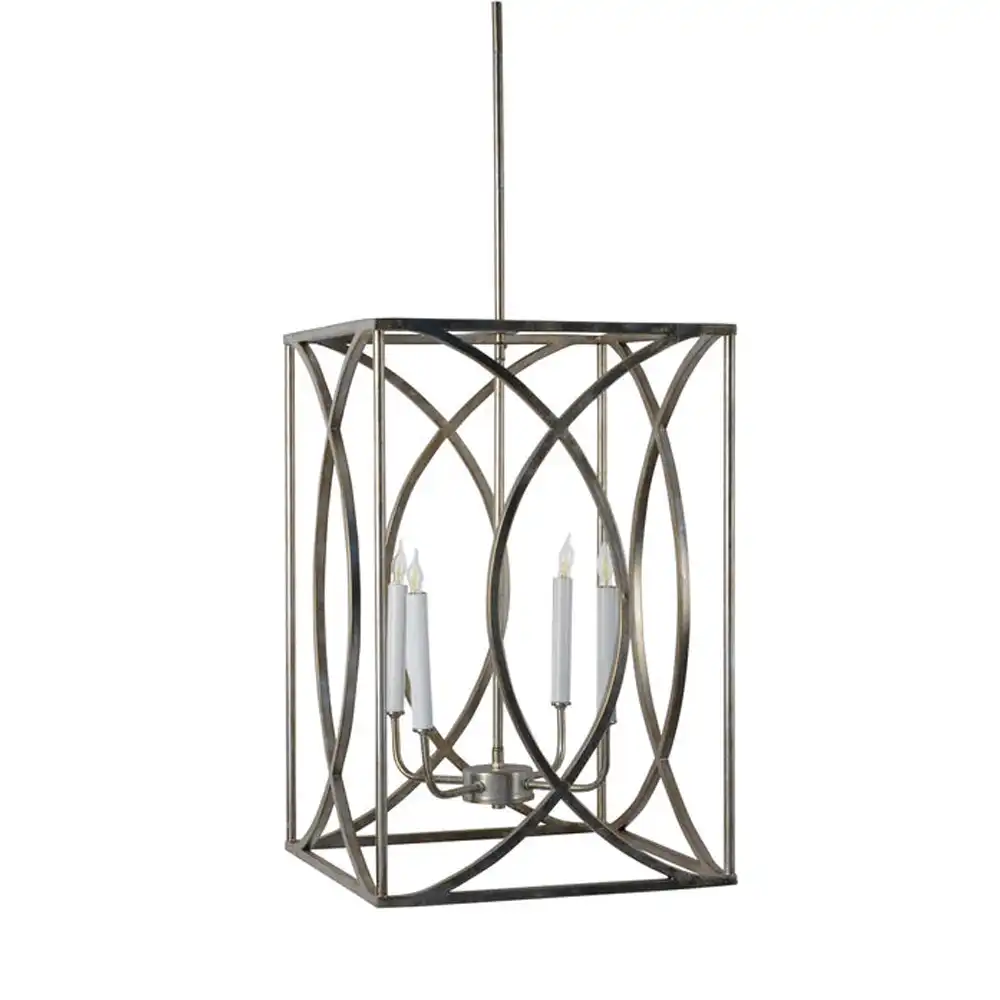 The design features an open, rectangular cage framework, intricately interwoven with graceful, intersecting arc patterns. This unique ‘interlace’ motif adds a profound sense of architectural interest and visual flow, allowing the four inner candelabra-style lights to cast their glow unhindered. These lights are thoughtfully positioned to provide balanced, ambient illumination, creating an inviting and well-lit atmosphere.