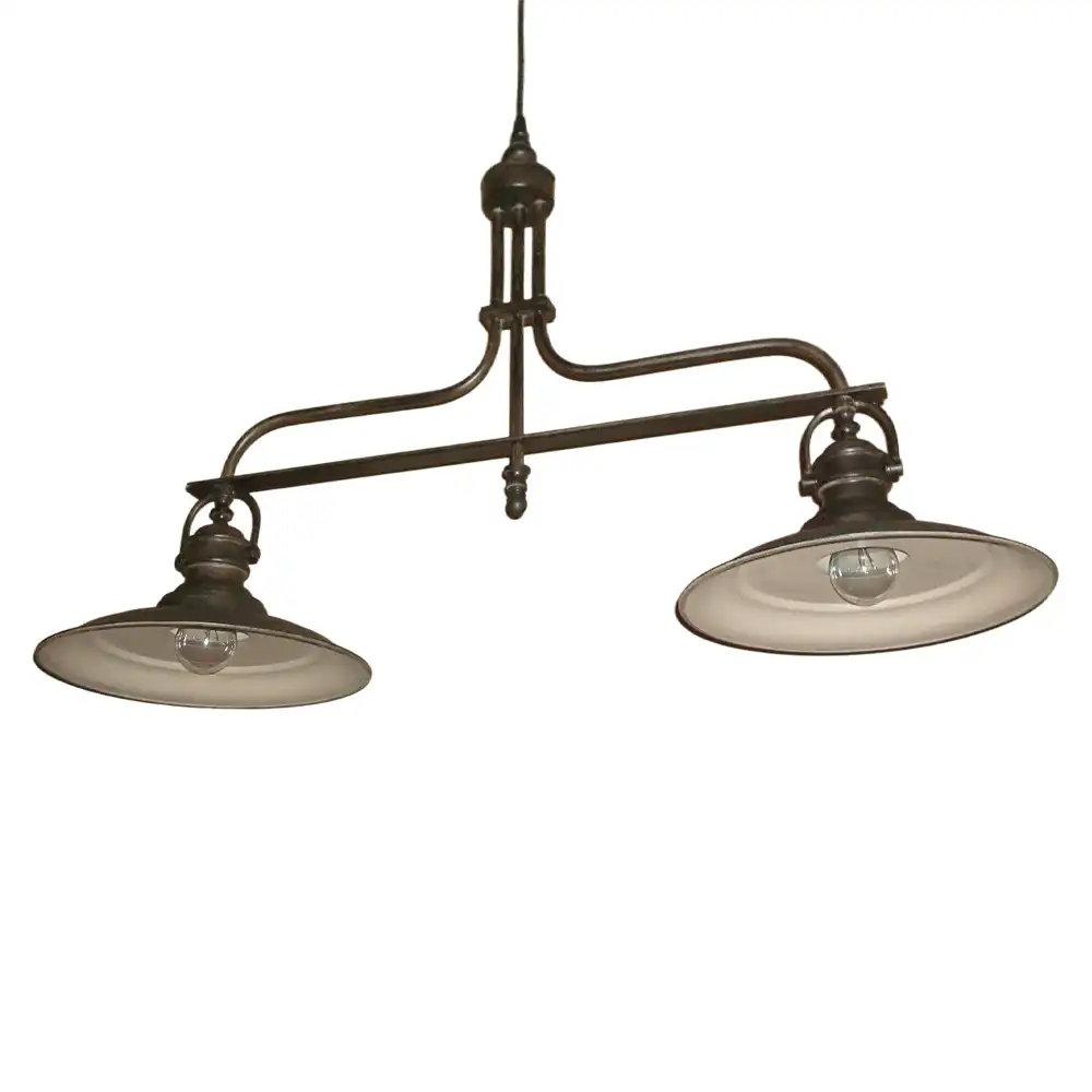 A handcrafted 2-light linear pendant in antique bronze finish with a weathered patina, featuring industrial metal shades and solid construction. Customizable for OEM/ODM lighting projects.