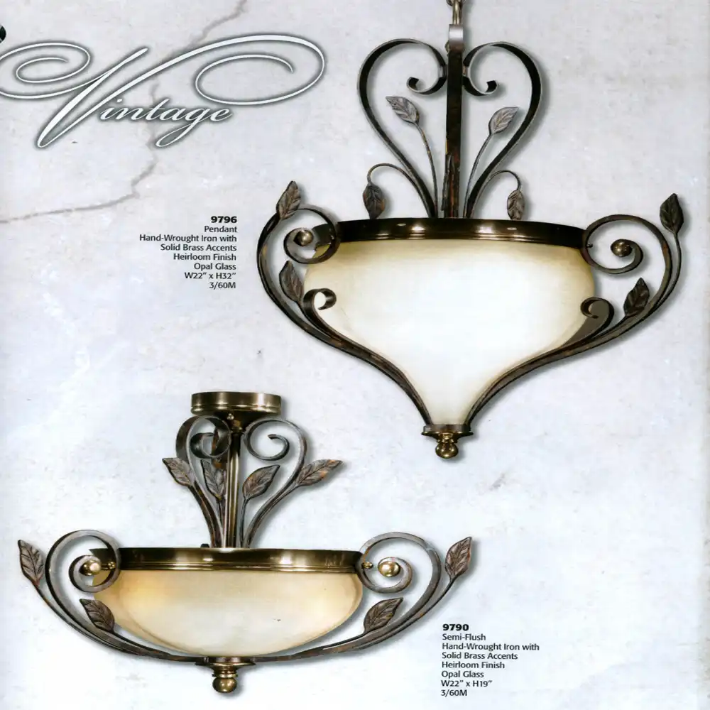 Handcrafted heirloom brass 3-light semi-flush pendant with opal glass shade, curled leaf-accented tubes, and supporting ring. Elegant, durable, and customizable for OEM/ODM wholesale lighting projects.