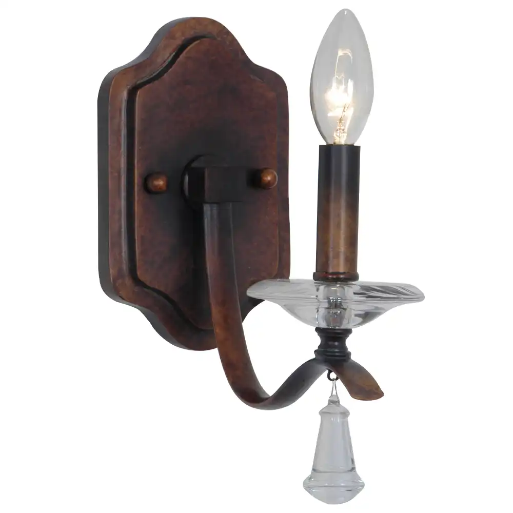 This single-light wall sconce is constructed from robust, high-strength metal, ensuring a stable structure that is built to withstand time and provide long-term compatibility. The distinguished hand-applied antique bronze finish offers a deep, textured appearance with warm copper undertones, providing an authentic, time-worn aesthetic that beautifully complements natural wood, stone accents, and rich color palettes. This durable finish, combined with the unique scalloped rectangular backplate, the gracefully curved arm, a prominent clear faceted crystal bobeche that beautifully catches and refracts light, and a delicate clear crystal teardrop dangling below (bulb not included), creates an artistic and welcoming presence. The exposed candle-style bulb (not included) allows for a focused, luminous, and inviting ambient glow, perfect for enhancing a cozy and stylish atmosphere with a touch of refined luxury.