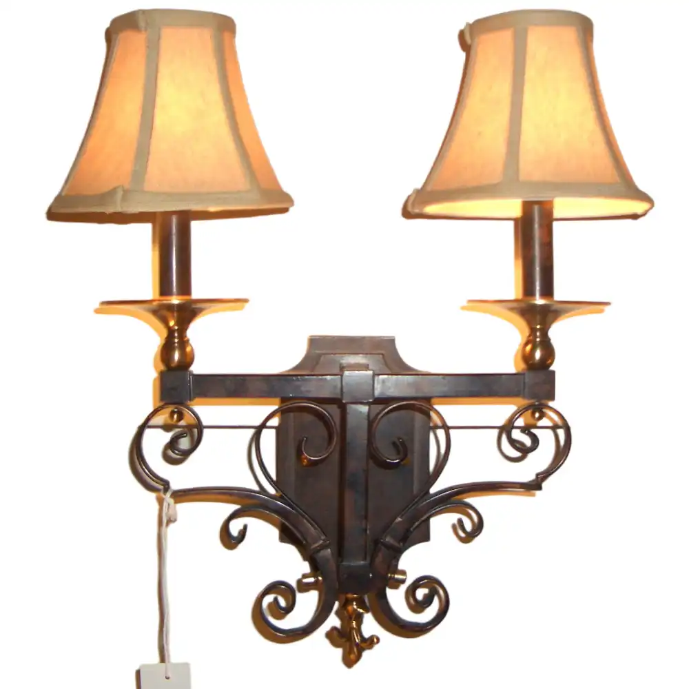 Introduce a touch of old-world grandeur and warm, inviting illumination to your interiors with our Heritage Forge Iron & Brass 2-Light Wall Sconce with Beige Shades. Meticulously handcrafted at our professional decorative light fixture factory in China, this exquisite wall lighting piece embodies a profound understanding of traditional, rustic, Tuscan, and transitional interior design. It seamlessly blends high-strength metal with a rich hand-applied distressed iron finish, complemented by contrasting polished brass accents, elaborate scrolled ironwork, and two classic beige fabric bell shades. Designed for enduring beauty, stability, and long-term reliability, it’s an ideal selection for discerning designers and end-users seeking distinctive, artistic, and functionally superior lighting solutions for hallways, dining areas, bedrooms, or any space desiring a sophisticated, historical accent.