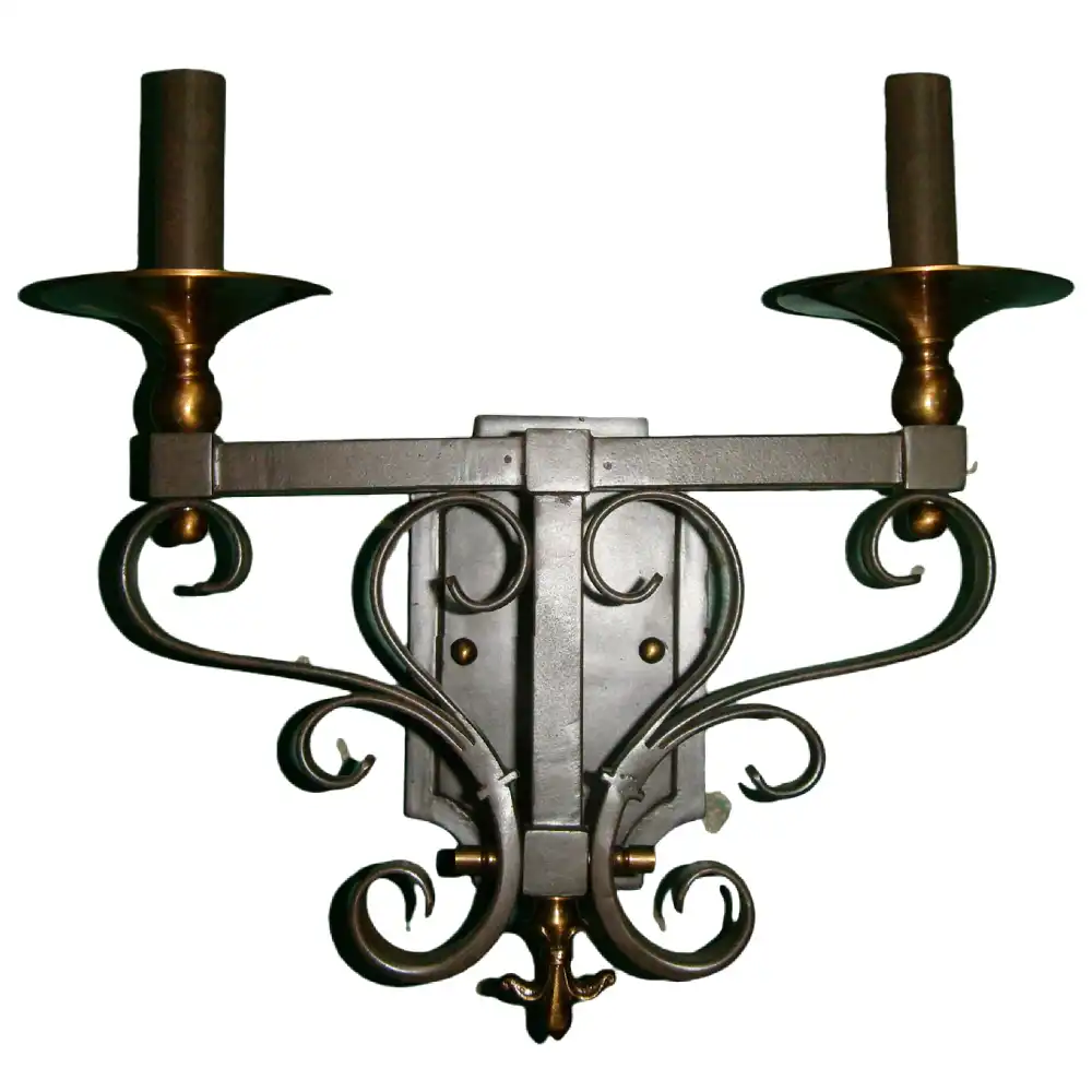 This two-light wall sconce is constructed from robust, high-strength metal, ensuring a stable structure that is built to withstand time and provide long-term compatibility. The distinguished hand-applied distressed iron finish offers a deep, textured gray-brown with subtle aged textures, providing an authentic, time-worn aesthetic that beautifully complements rustic stone, dark wood, and richly textured fabrics. This durable finish, combined with the classic rectangular backplate, the substantial geometric base, elaborate scrolled ironwork with fleur-de-lis inspired details, prominent polished brass bobeches and finials, and two elegant beige fabric bell shades (bulbs not included), creates an artistic and powerful presence. The soft beige shades beautifully diffuse the light, creating a gentle, ambient glow that enhances the historical feel of any room.