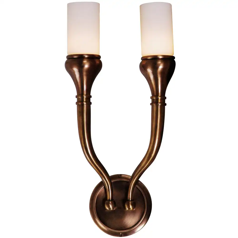 This two-light wall sconce is constructed from robust, high-strength metal, ensuring a stable structure that is built to withstand time and provide long-term compatibility. The elegant hand-applied bronze finish offers a deep, multi-tonal brown with subtle highlights, providing a sophisticated antique-yet-modern aesthetic that complements both traditional and contemporary decor. This durable finish, combined with the subtle round backplate, the gracefully curved, symmetrical arms with their distinctive banded details, and the two prominent frosted cylinder-shaped glass shades, creates a minimalist yet artistic presence. The frosted glass beautifully diffuses the light (bulbs not included), creating a soft, bright, and inviting ambient glow that is perfect for enhancing a serene and stylish atmosphere.