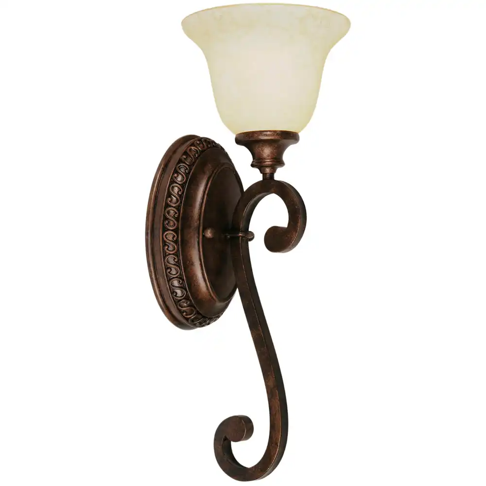 This single-light wall sconce is constructed from robust, high-strength metal, ensuring a stable and sturdy structure that is built to withstand the test of time. The distinguished aged bronze (or distressed dark brown/copper) finish offers a rich, warm tone with subtle aged highlights, providing an authentic and classical aesthetic that complements a wide range of rustic and traditional color palettes and design schemes. This elegant finish, combined with the intricately detailed round backplate featuring a vine-like border, and the dramatically sweeping and scrolled metal arm, creates an artistic and captivating presence. A single inverted bell-shaped frosted amber (or mottled alabaster-style) glass shade diffuses light softly and evenly, creating a warm, ambient glow perfect for hallways, living rooms, bedrooms, or as a charming accent in any space seeking a blend of rustic elegance and inviting light.