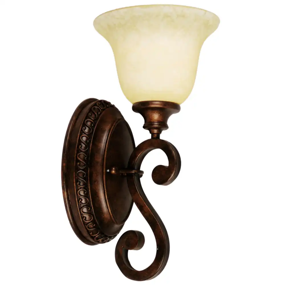 This single-light wall sconce is constructed from robust, high-strength metal, ensuring a stable and sturdy structure that is built to withstand the test of time. The distinguished aged bronze (or distressed dark brown/copper) finish offers a rich, warm tone with subtle aged highlights, providing an authentic and classical aesthetic that complements a wide range of rustic and traditional color palettes and design schemes. This elegant finish, combined with the intricately detailed round backplate featuring a vine-like border, and the gracefully scrolled metal arm, creates an artistic and captivating presence. A single inverted bell-shaped frosted amber (or mottled alabaster-style) glass shade diffuses light softly and evenly, creating a warm, ambient glow perfect for hallways, living rooms, bedrooms, or as a charming accent in any space seeking a blend of rustic elegance and inviting light.