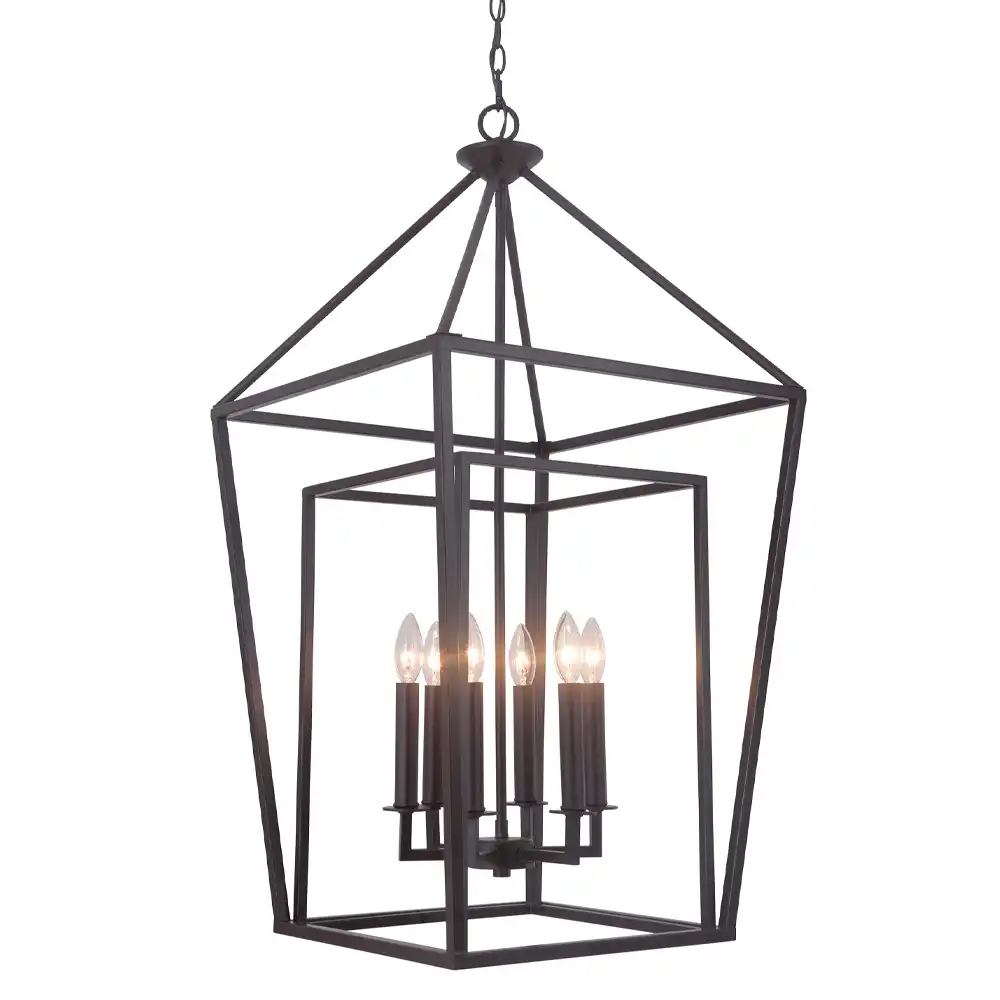 Each “Industrial Grandeur” chandelier is a testament to the superior craftsmanship of our professional decorative light fixture factory in China. Meticulously handcrafted entirely from high-strength metal, this fixture boasts a stable, robust structure designed for enduring performance and lasting beauty. The impressive design features an open, inverted pyramidal-top outer cage, which elegantly frames a smaller, perfectly proportioned inner cage. This “nested” effect creates striking depth and visual intrigue, enhancing its architectural presence. Within the inner cage, six candelabra-style light holders are gracefully positioned, providing abundant and multi-directional illumination that makes it an ideal centerpiece for grand foyers, expansive dining rooms, great rooms, or sophisticated commercial reception spaces.