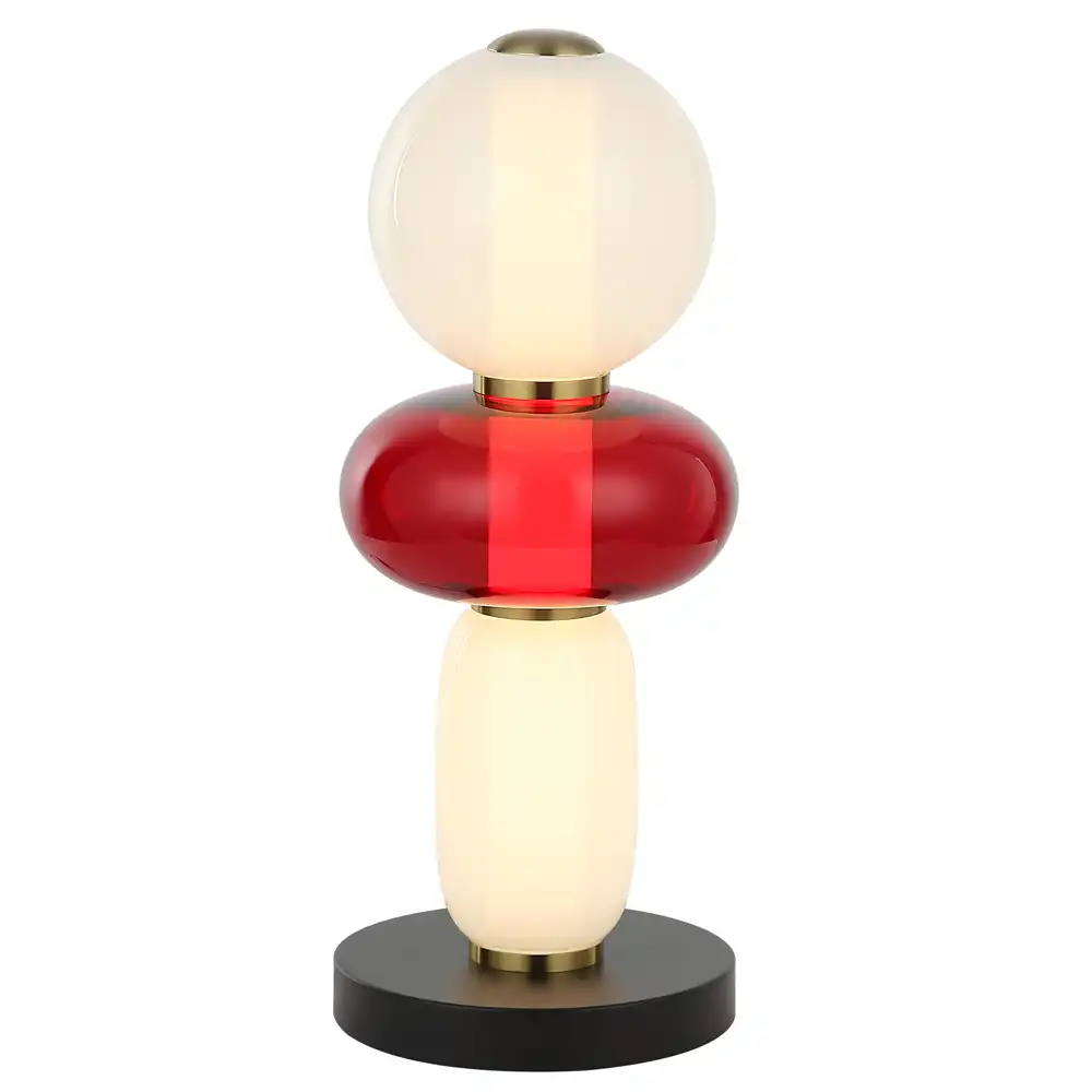 The Kaleido Orb lamp is meticulously handcrafted, anchored by a high-strength metal base that ensures an exceptionally stable structure and enduring reliability for long-term use. Its defining feature is a captivating stack of expertly hand-blown glass shades in a delightful array of organic shapes, each housing efficient and long-lasting integrated LED technology. The showcased design features a harmonious blend of translucent white and a striking, vibrant red, creating a mesmerizing interplay of light and bold color that transforms any environment into an illuminated artwork. This unique sculptural form, reminiscent of modern art installations, makes it an ideal centerpiece for living areas, creative workspaces, or as a distinctive, mood-setting lamp. Polished brass accents subtly delineate each glass segment, adding a touch of refined luxury.