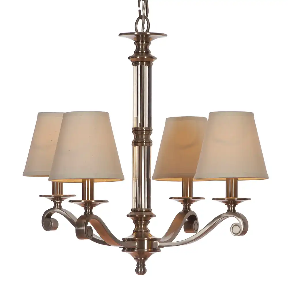Each of the four gracefully curved arms supports a cream fabric lampshade, gently diffusing light to create a warm, inviting ambiance. Every component, from the precision-welded arms to the hand-polished surfaces, showcases expert craftsmanship and attention to detail—hallmarks of our factory’s commitment to quality lighting manufacturing.