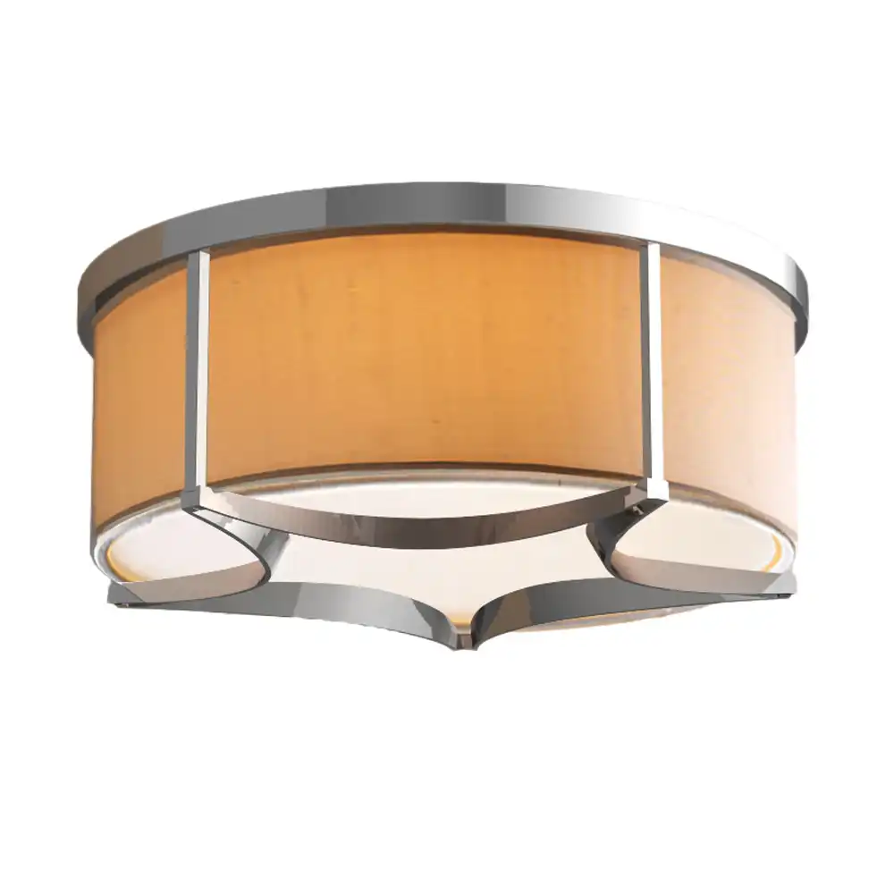 Encased within the sleek metal frame is a warm beige fabric shade, softly diffusing light through its gently textured surface. The fabric’s warm tone contrasts beautifully with the crisp coolness of the chrome, producing a balanced aesthetic that feels both inviting and luxurious.