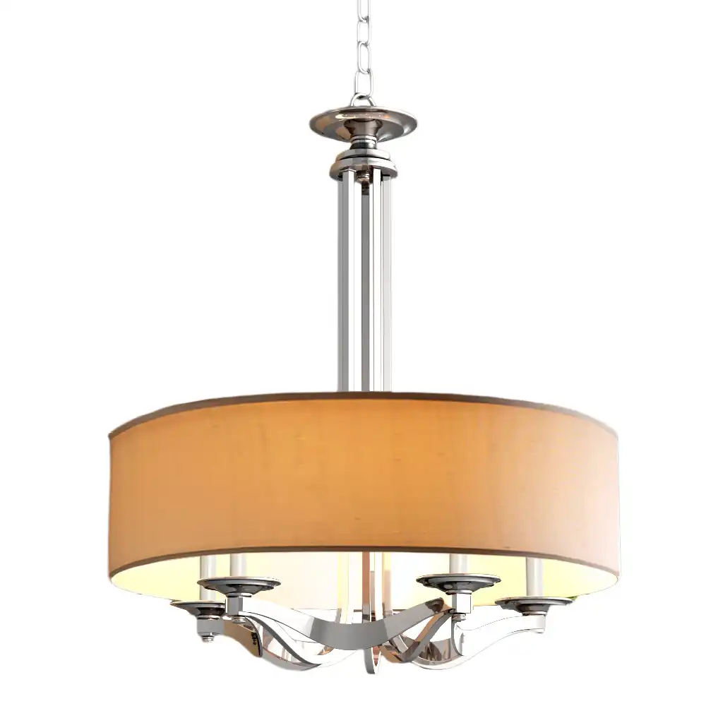 Encircling the frame is a warm beige fabric drum shade, subtly translucent to emit a soft, ambient glow. This harmonious blend of polished metal and textured fabric creates a balance of luxury and comfort, making it suitable for both residential and commercial interiors.