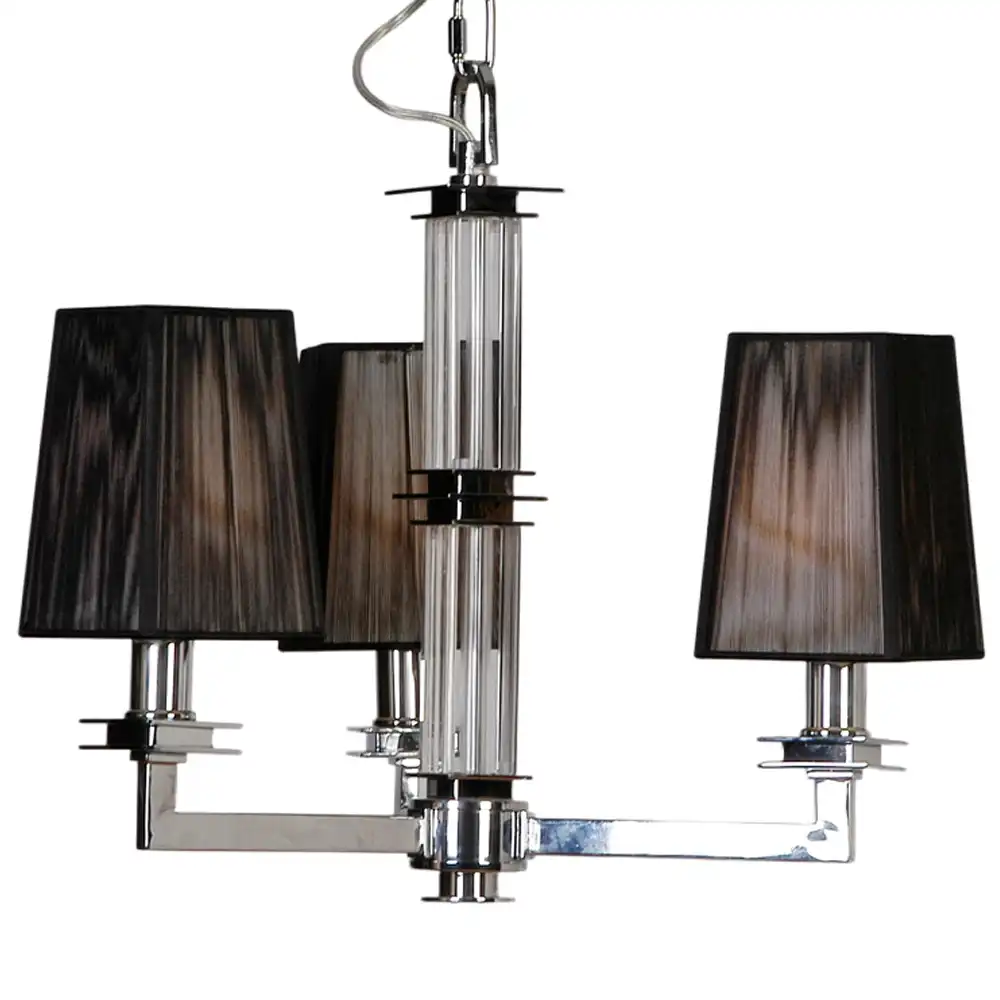 The Luna Noir Elegance Chandelier is a refined fusion of modern geometry and timeless sophistication. This handcrafted 3-light pendant features a hand-polished Chrome finish, characterized by a mirror-like metallic luster with a smooth, reflective surface. The gleaming metal contrasts beautifully with the black pleated fabric shades, creating a visual balance of light and shadow that enhances any contemporary interior.