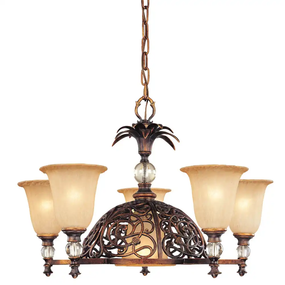 Positioned evenly around the hemisphere’s edge are five light holders, each topped with a tapered, petunia-shaped amber scavo glass shade. Beneath each shade hangs a clear K9 crystal ball for added brilliance. At the center of the hemisphere, a sixth light holder is suspended with an inverted matching shade, enhancing the layered lighting design.