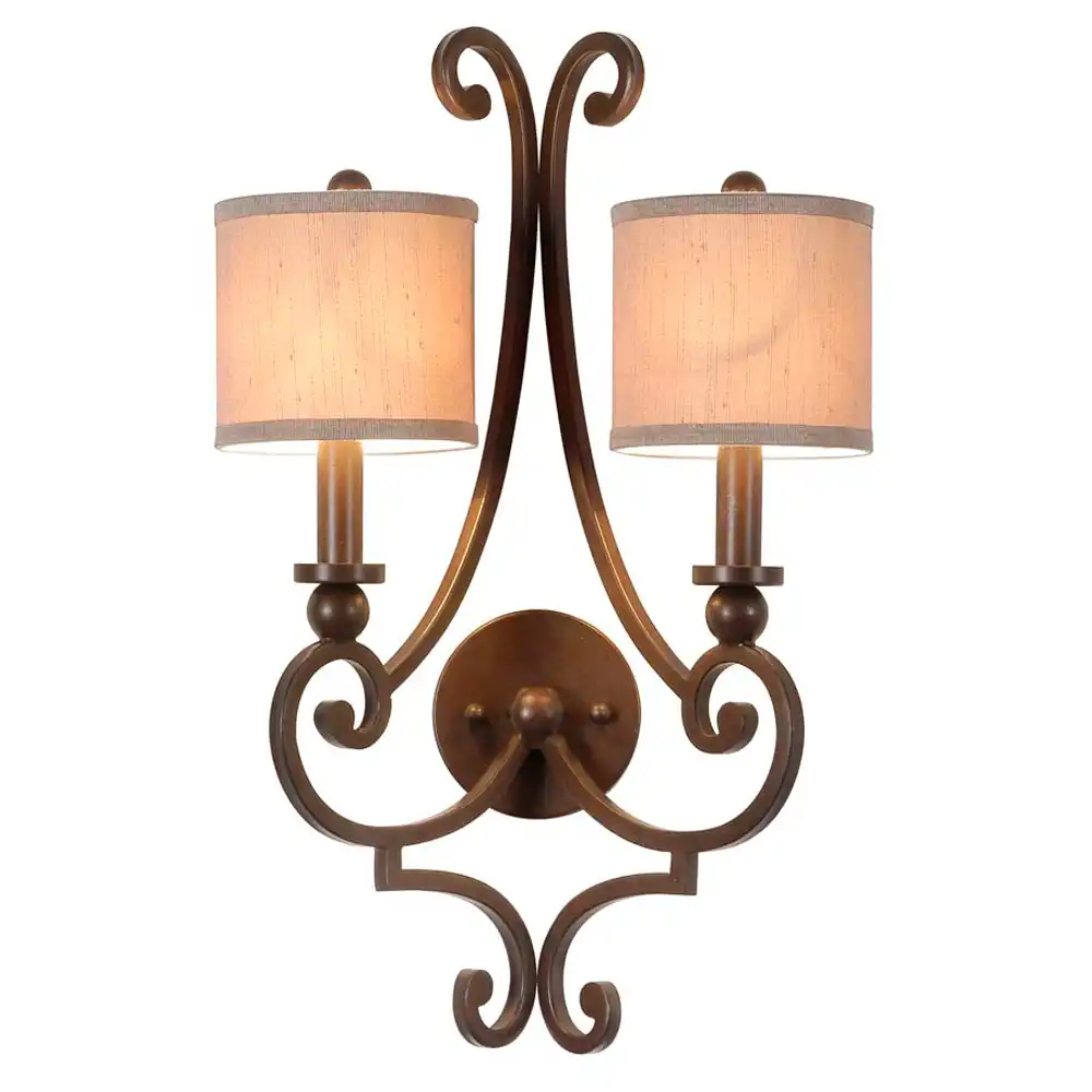 Introduce a touch of timeless elegance and warm, inviting illumination to your interiors with our Mediterranean Bronze Scrollwork 2-Light Wall Sconce with Linen Drum Shades. Meticulously handcrafted at our professional decorative light fixture factory in China, this exquisite wall lighting piece embodies a profound understanding of Mediterranean, Tuscan, rustic-chic, and traditional interior design. It seamlessly blends high-strength metal with a rich hand-applied distressed bronze finish, elaborate scrollwork, and two elegant cream linen drum shades. Designed for enduring beauty, stability, and long-term reliability, it’s an ideal selection for discerning designers and end-users seeking distinctive, artistic, and functionally superior lighting solutions for hallways, living rooms, dining rooms, or any space desiring a sophisticated, inviting accent.