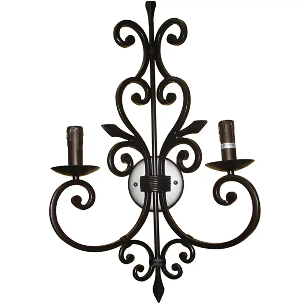 Elegant 2-light wall sconce with a handcrafted forged iron finish, elaborate scrollwork, and candle-style illumination. Features a Mediterranean aesthetic for lasting charm and ambient light. Perfect for custom projects and wholesale.
