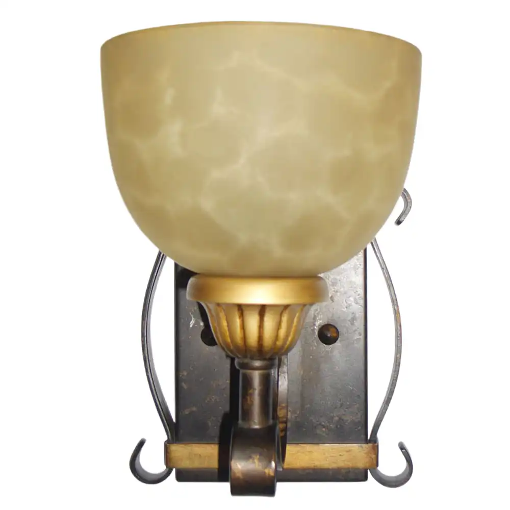 This single-light wall sconce is constructed from robust, high-strength metal, ensuring a stable structure that is built to withstand time and provide long-term compatibility. The distressed dark bronze finish offers a rich, aged appearance, providing an authentic, hand-crafted aesthetic that complements traditional decor and natural stone elements. This durable finish, combined with the rectangular backplate, the gracefully curved metal accents, the subtle gold-painted wood-like details, and the prominent marbleized bowl-shaped glass shade, creates an artistic and welcoming presence. The marbleized glass, with its unique swirls and patterns, beautifully diffuses the light (bulb not included), creating a soft, ambient glow that is perfect for enhancing a serene and elegant atmosphere.