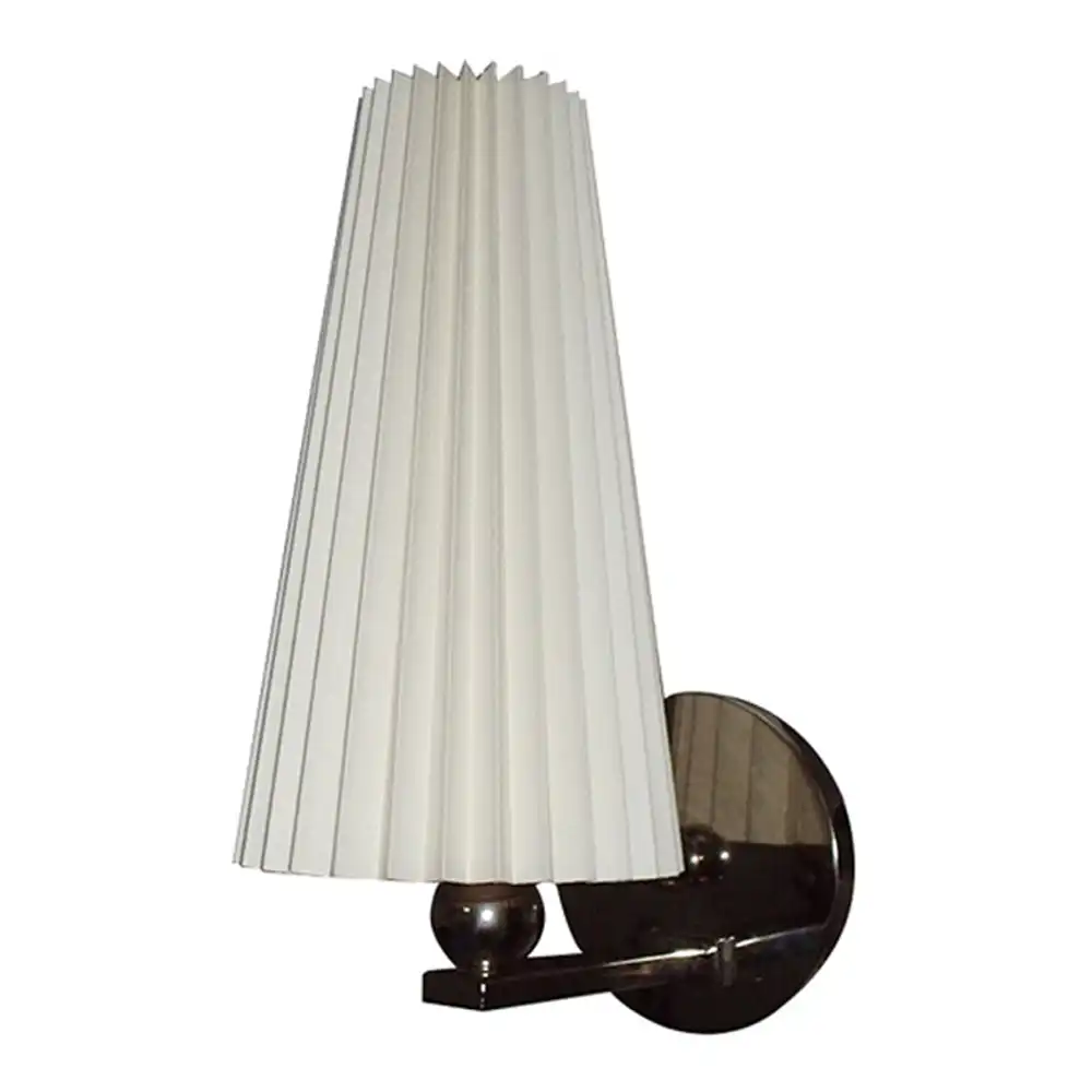 This single-light wall sconce is constructed from robust, high-strength metal, ensuring a stable and sturdy structure that is built to withstand the test of time. The distinguished polished chrome finish offers a brilliant, reflective aesthetic that complements modern fixtures and a wide range of sophisticated color palettes. This elegant finish, combined with the clean circular backplate, a minimalist arm, and a striking ball accent, creates a sleek and contemporary presence. A single tall, conical pleated fabric shade, with its crisp, architectural folds, diffuses light softly and evenly, creating a warm, ambient glow perfect for hallways, living rooms, bedrooms, or as a chic accent in any space.