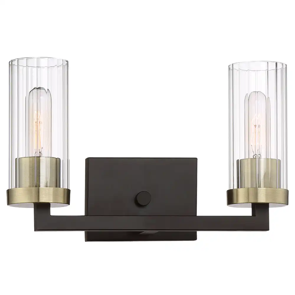 This two-light vanity sconce is constructed from robust, high-strength metal, ensuring a stable structure that is built to withstand time and provide long-term compatibility. The striking matte black finish provides a bold, contemporary foundation, offering a sophisticated contrast to the warm, subtle sheen of the aged brass components. This durable finish, combined with the clean lines of the rectangular backplate and horizontal bar, and the prominent ribbed clear glass cylinder shades with their aged brass collars, creates an artistic and powerful presence. The ribbed texture on the clear glass adds a subtle visual interest while still allowing for maximum, unobstructed light (bulbs included as shown, ideal for decorative Edison-style bulbs), perfect for task lighting in a vanity area or providing ambient light in a living space.