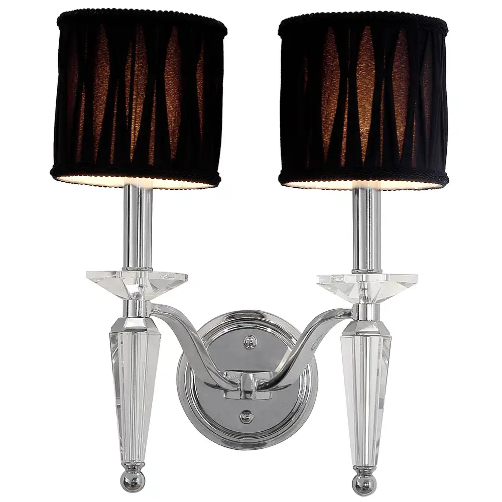 This two-light wall sconce is constructed from robust, high-strength metal, ensuring a stable structure that is built to withstand time and provide long-term compatibility. The dazzling polished chrome finish offers a highly reflective, mirror-like surface that brings a bright, modern touch to any room. This durable finish, combined with the classic round backplate, the gracefully curved arms, the prominent faceted crystal columns culminating in polished spheres, and the two elegant pleated black fabric drum shades with braided trim, creates a striking and versatile presence. The rich black shades beautifully filter the light (bulbs not included), creating a soft, warm, and inviting ambient glow that is perfect for enhancing a serene and stylish atmosphere with a touch of refined luxury.
