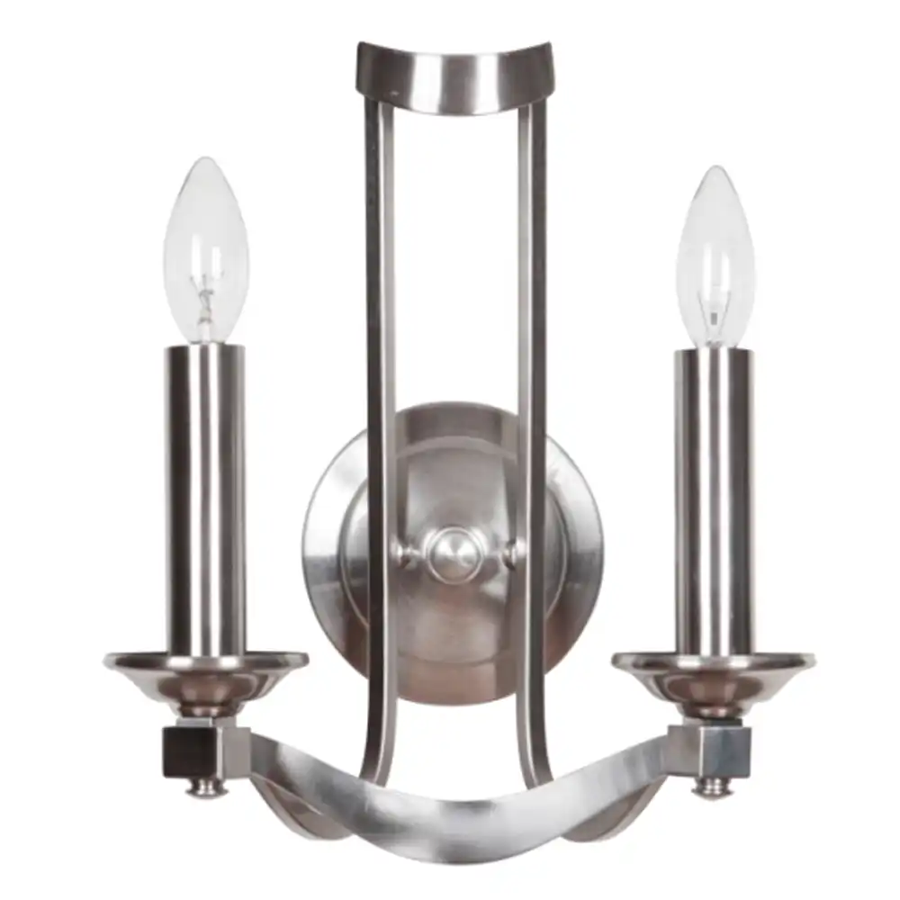 This two-light wall sconce is constructed from robust, high-strength metal, ensuring a stable structure that is built to withstand time and provide long-term compatibility. The sleek hand-applied brushed nickel finish offers a contemporary, understated elegance with a subtle metallic sheen, beautifully complementing the clear candelabra bulbs. This durable finish, combined with the elegant circular backplate, a distinctive clean-lined, U-shaped arched metal frame with a subtly curved bottom accent, and two prominent candelabra-style bulb holders (bulbs included for stylistic representation, but typically sold separately), creates an artistic and powerful presence. The exposed candelabra bulbs provide sparkling, direct light, while the brushed nickel frame enhances a grand and stylish atmosphere with refined elegance. The design, reminiscent of classic candelabra forms updated with a sleek modern twist, makes it a timeless addition.