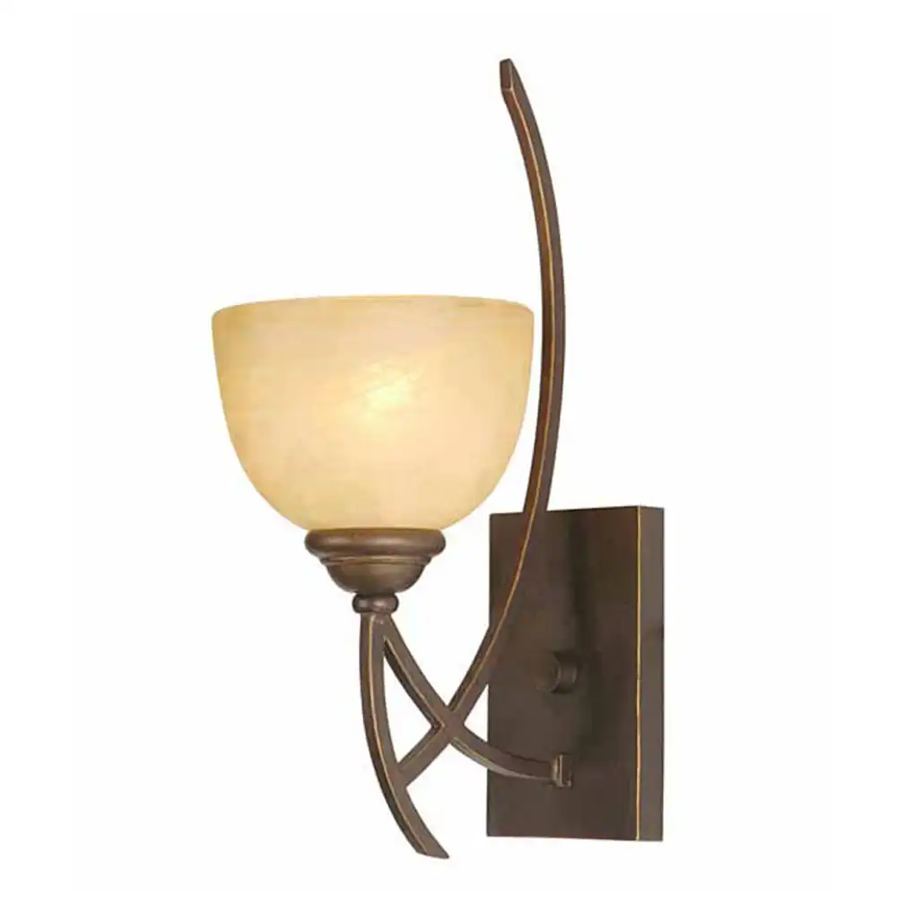 This single-light sconce is constructed from robust, high-strength metal, ensuring a stable and sturdy structure that is built to withstand the test of time. The sophisticated bronze finish, with its rich, dark tones and subtle highlights, offers a modern yet timeless aesthetic. This elegant finish, combined with the gracefully curved arm and intersecting base detail, creates an artistic and sculptural presence that beautifully complements contemporary, transitional, and even industrial-chic design styles. The alabaster-style bowl glass shade diffuses light softly and warmly, casting an inviting, ambient glow perfect for hallways, living areas, bedrooms, or as an elegant accent in any room.