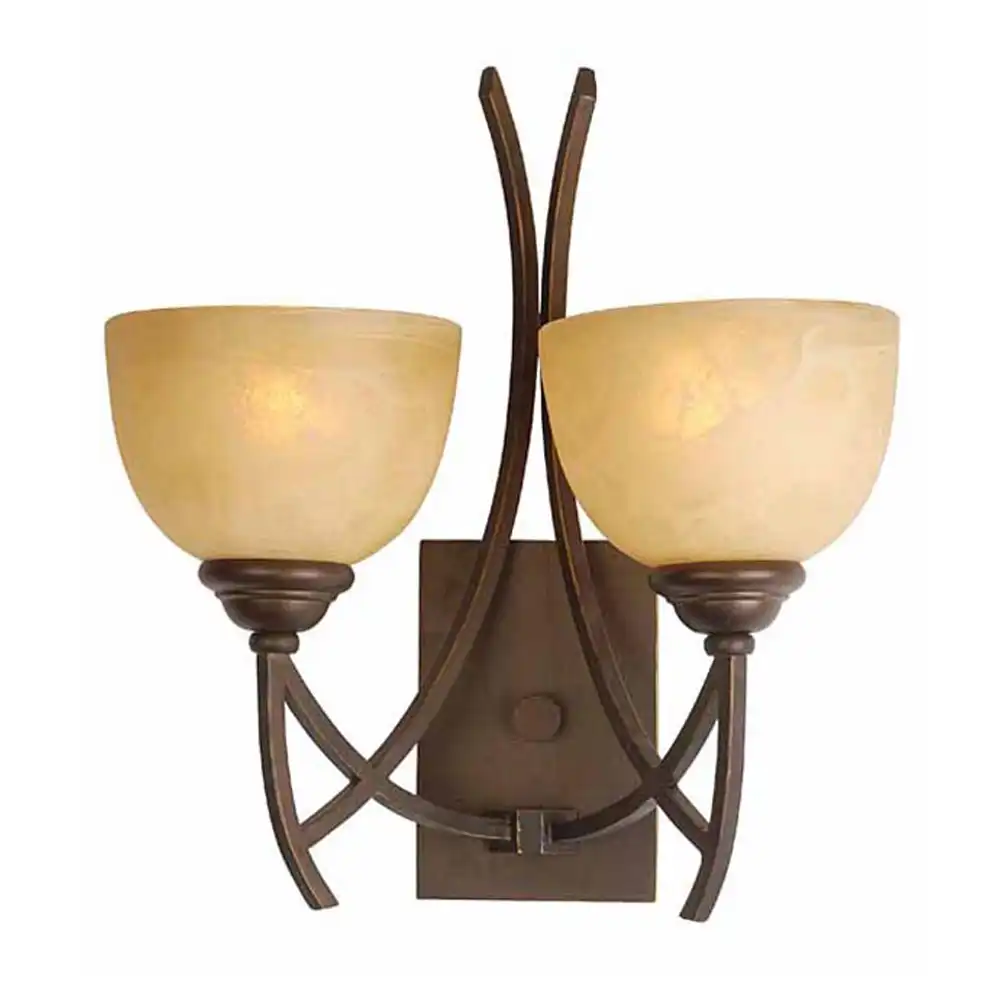 This two-light wall fixture is constructed from robust, high-strength metal, ensuring a stable and sturdy structure that is built to withstand the test of time. The sophisticated bronze finish, with its rich, dark tones and subtle highlights, offers a modern yet timeless aesthetic. This elegant finish, combined with the gracefully curved and intersecting arms, creates an artistic and sculptural presence that beautifully complements contemporary, transitional, and even industrial-chic design styles. The golden alabaster-style bowl glass shades diffuse light softly and warmly, casting an inviting, ambient glow perfect for vanity areas, powder rooms, or as an elegant accent in hallways.