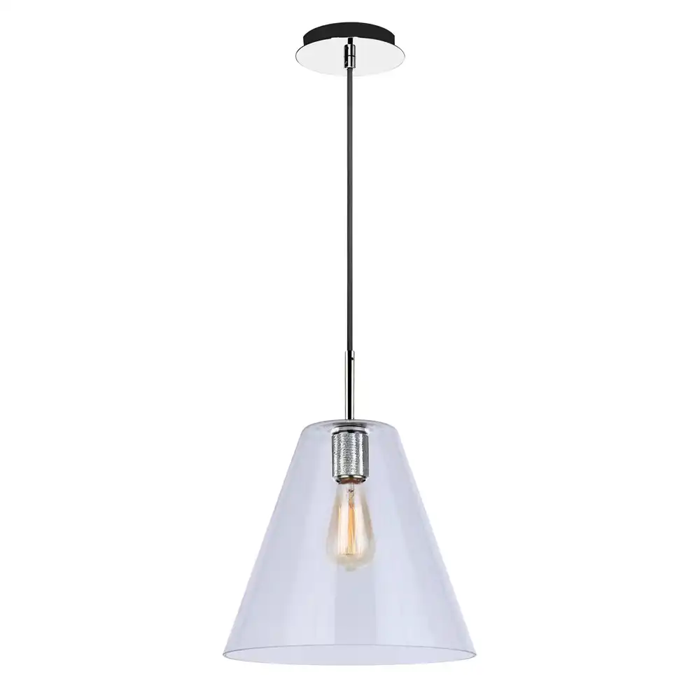 The light features a clear glass cone-shaped shade, crafted for optical clarity and subtle sophistication, allowing the bulb’s warm glow to radiate freely and illuminate spaces evenly. The metal hardware is finished in polished chrome, showcasing a mirror-like metallic sheen with a cool silver undertone that complements both minimalist and industrial-inspired interiors. The chrome plating not only enhances the visual appeal but also provides superior resistance to wear and corrosion.