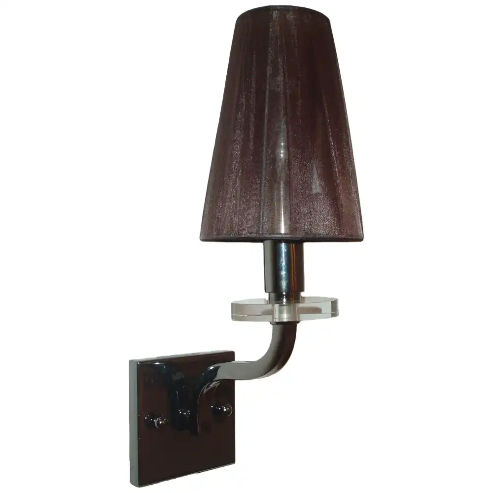 This single-light wall sconce is constructed from robust, high-strength metal, ensuring a stable structure that is built to withstand time and provide long-term compatibility. The dazzling polished chrome finish offers a highly reflective, mirror-like surface that brings a bright, modern touch to any room. This durable finish, combined with the clean lines of the rectangular backplate, the gently curved arm, and the prominent black fabric cone-shaped shade, creates a striking and versatile presence. The rich black shade beautifully filters the light (bulb not included), creating a soft, warm, and inviting ambient glow that is perfect for enhancing a serene and stylish atmosphere with a touch of modern sophistication.