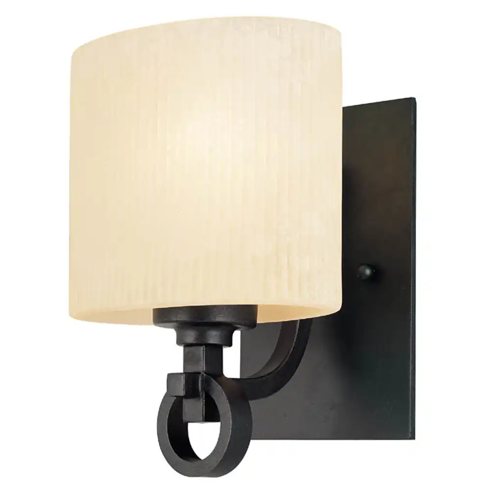 This single-light wall sconce is constructed from robust, high-strength metal, ensuring a stable structure that is built to withstand time and provide long-term compatibility. The sophisticated matte black finish offers a clean, understated aesthetic that complements a wide range of decor styles from industrial to modern farmhouse. This durable finish, combined with the subtle rectangular backplate, the strong angular arm featuring a decorative ring detail, and the prominent ribbed, alabaster-style drum-shaped glass shade, creates a refined and versatile presence. The ribbed texture and alabaster-style glass beautifully diffuse the light (bulb not included), creating a soft, ambient glow that is perfect for enhancing a serene atmosphere.