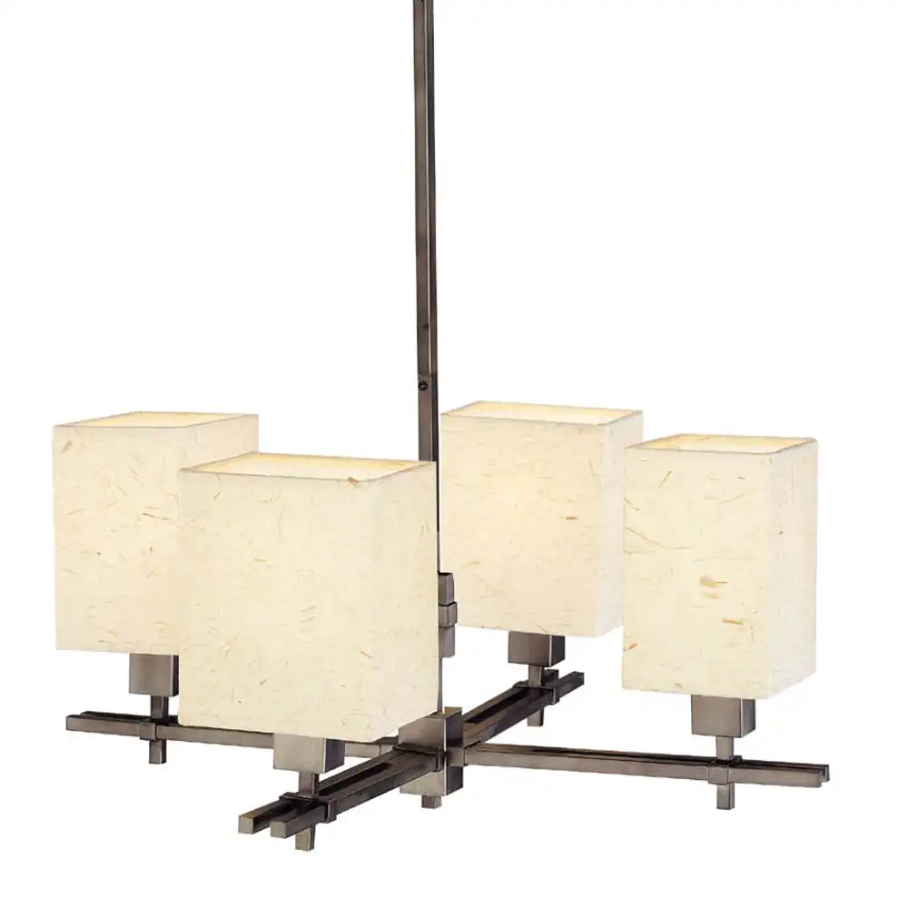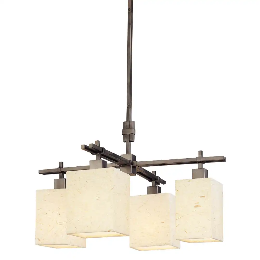 The Modern Geometric 4-Light Pendant redefines contemporary elegance through clean lines, architectural balance, and exquisite craftsmanship. Crafted from high-strength metal, the fixture features a textured deep bronze finish with subtle satin undertones, exuding sophistication and warmth. The refined finish enhances the fixture’s linear form while complementing the natural beauty of its handcrafted rectangular parchment-fiber shades, which gently diffuse light to create an inviting ambiance.