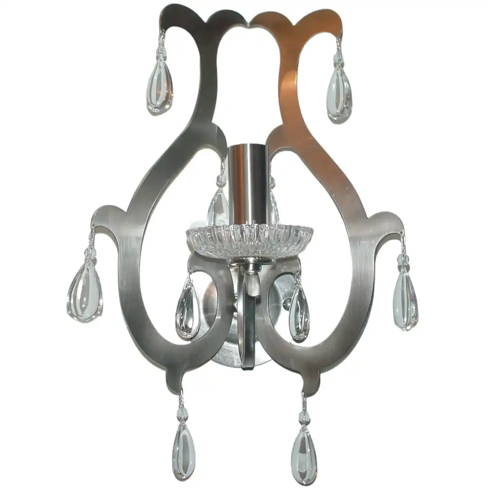 This single-light wall sconce is constructed from robust, high-strength metal, ensuring a stable structure that is built to withstand time and provide long-term compatibility. The sophisticated brushed nickel finish offers a soft, muted metallic sheen that is both contemporary and versatile, complementing a wide range of modern and classic decor palettes. This durable finish, combined with the elegant, fluidly curved metal frame, the central clear faceted glass bobeche, and the prominent internal light source (bulb not included), creates a captivating and artistic presence. Adorned with numerous clear crystal drops and pendants of varying shapes and sizes, this sconce catches and refracts the light, creating a dazzling display of brilliance and enhancing the ambiance with a luxurious, ethereal glow.