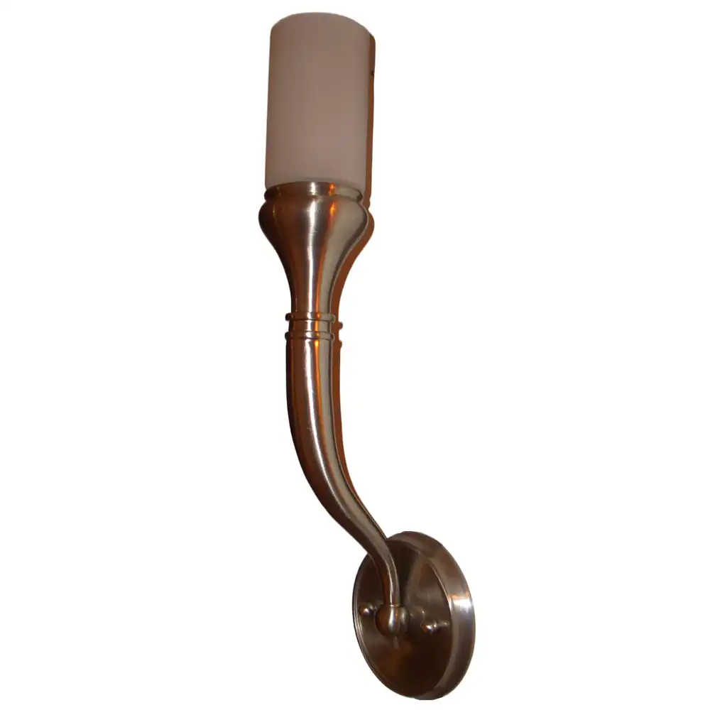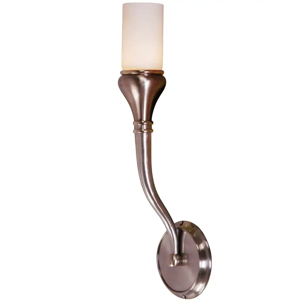 Sleek 1-light wall sconce with a handcrafted brushed nickel finish, gracefully curved arm, and a distinctive frosted cylinder glass shade. Features a modernist design for bright, diffused illumination.
