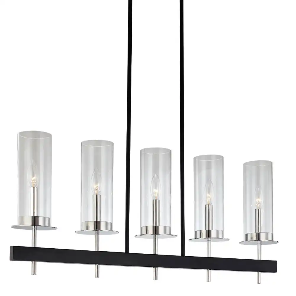 The light features a dual-finish design: a matte black rectangular frame paired with polished nickel accents. This combination delivers a striking contrast — the matte black finish provides modern restraint and structure, while the polished nickel detailing adds a sleek, reflective quality that enhances light distribution. Each light is encased in a clear cylindrical glass shade, amplifying brightness and showcasing the sculptural integrity of the design.