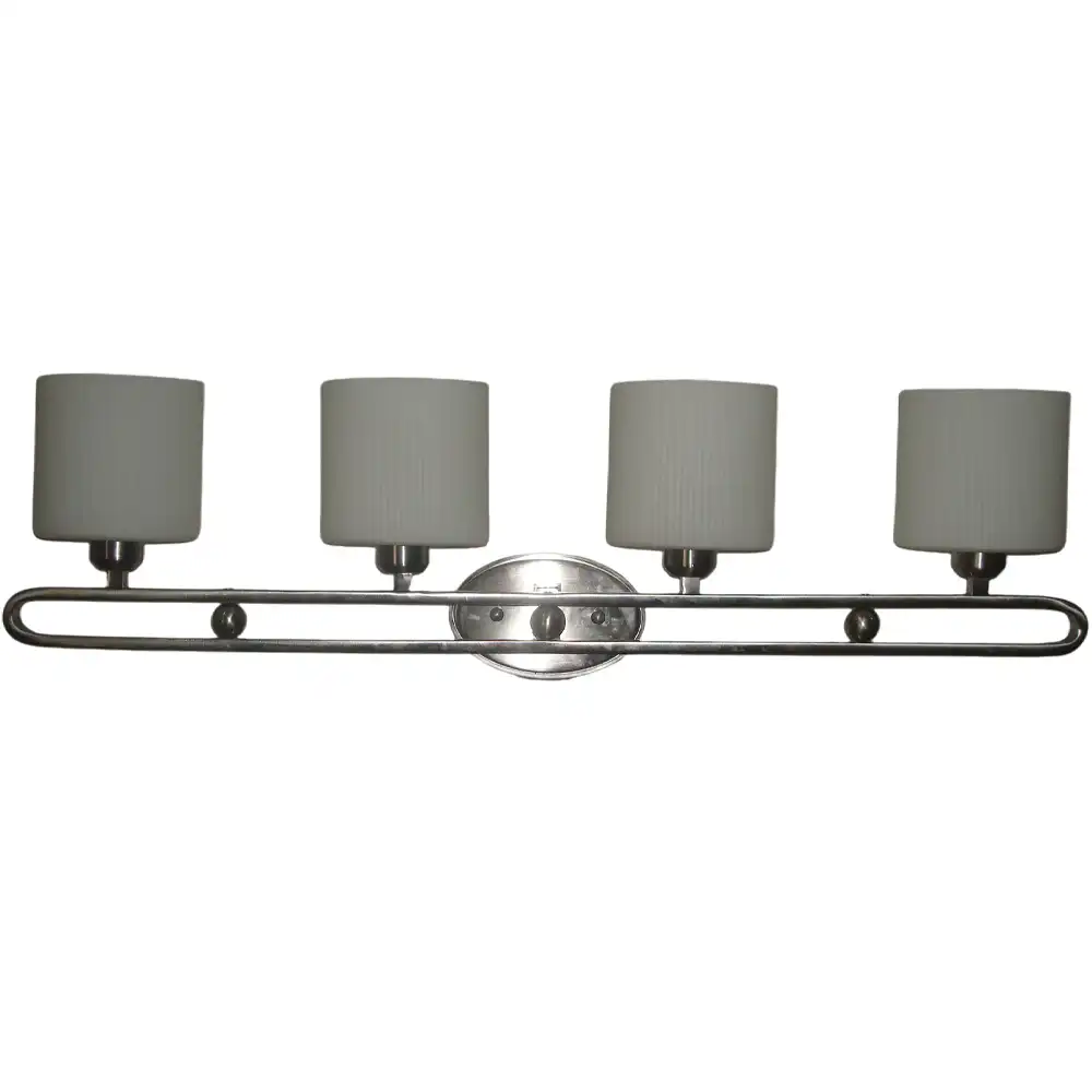 This four-light wall lighting fixture is constructed from robust, high-strength metal, ensuring a stable structure that is built to withstand time and provide long-term compatibility. The distinguished brushed nickel finish offers a muted, satin-like sheen that brings a contemporary and sophisticated touch to any room. This durable finish, combined with the clean lines of the oval backplate, the elongated horizontal bar with graceful curved ends, decorative spherical accents along the bar, and the four prominent frosted glass cylinder shades (bulbs not included), creates an artistic and welcoming presence. The soft frosted glass shades beautifully diffuse the light, creating a gentle, luminous, and inviting ambient glow that is perfect for enhancing a chic and stylish atmosphere.