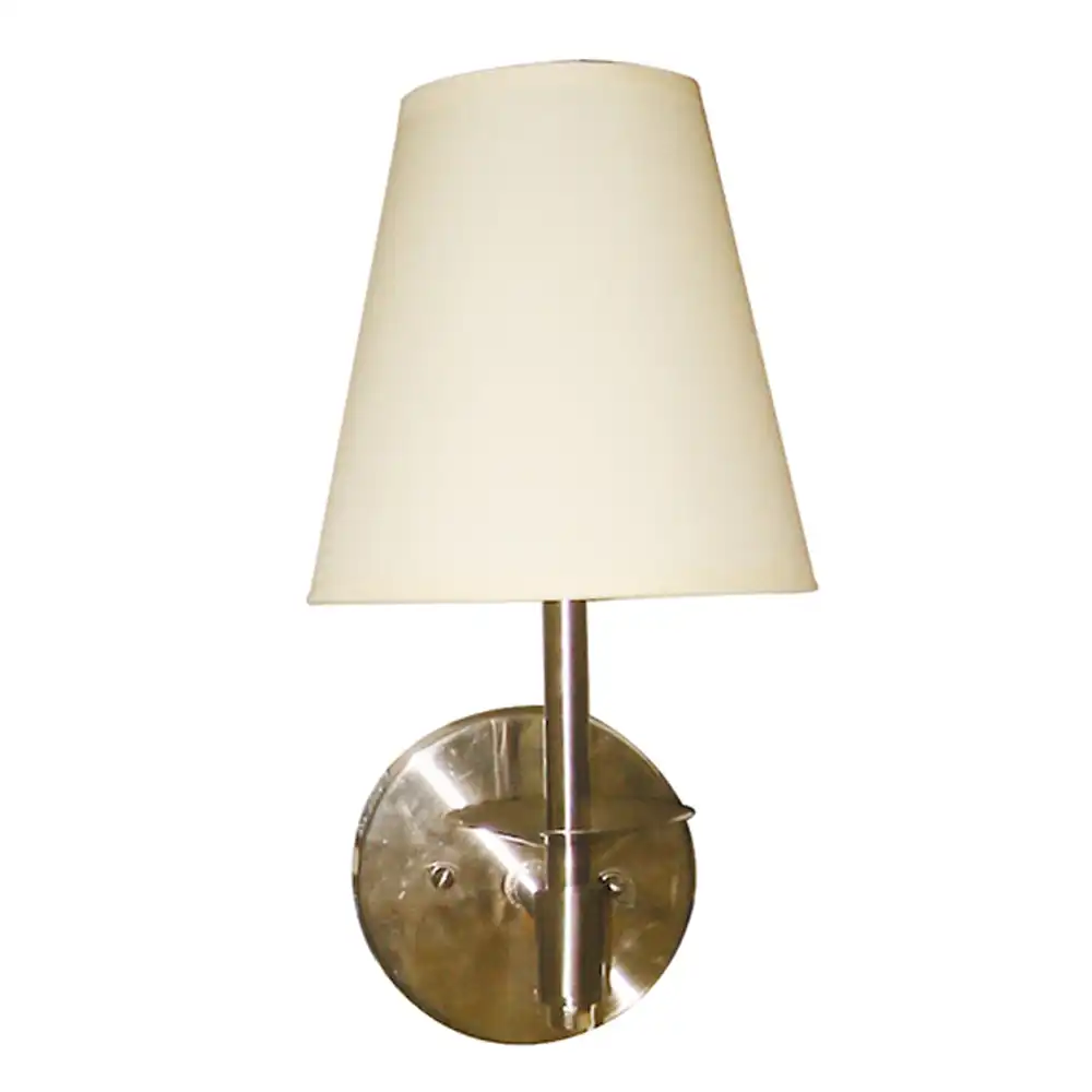 This single-light wall sconce is constructed from robust, high-strength metal, ensuring a stable and sturdy structure that is built to withstand the test of time. The distinguished polished nickel (or chrome) finish offers a brilliant, reflective aesthetic that complements modern fixtures and a wide range of sophisticated color palettes. This elegant finish, combined with the clean circular backplate and a single straightforward vertical arm, creates a sleek and contemporary presence. A single tall, tapered white (or off-white) fabric shade, with its classic drum shape, diffuses light softly and evenly, creating a warm, ambient glow perfect for hallways, living rooms, bedrooms, or as a chic accent in any space.