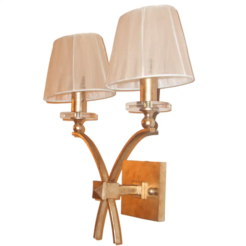 Introduce a touch of sophisticated contemporary design and balanced, inviting illumination to your interiors with our Modernist Ribbon Gold 2-Light Wall Sconce with Sheer Tapered Shades. Meticulously handcrafted at our professional decorative light fixture factory in China, this exquisite wall lighting piece embodies a profound understanding of modern, minimalist, and transitional interior design. It seamlessly blends high-strength metal with a rich hand-applied gold leaf finish, delicate crystal accents, and two distinctive sheer tapered fabric shades. Designed for enduring beauty, stability, and long-term reliability, it’s an ideal selection for discerning designers and end-users seeking distinctive, artistic, and functionally superior lighting solutions for hallways, bedrooms, living rooms, or any space desiring a refined, contemporary accent.