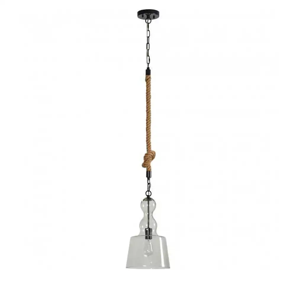 The defining characteristic of this pendant is its genuine natural jute rope suspension, artfully fashioned with a decorative knot. This element imparts a distinctive coastal, farmhouse, or industrial-chic aesthetic, adding warmth and organic texture to any interior. The rope seamlessly transitions to a clear, hand-blown glass shade, featuring a distinctive bell-like silhouette with a charmingly sculpted, elongated neck. This clear glass not only protects the bulb but also maximizes light output, creating an inviting and well-illuminated space.