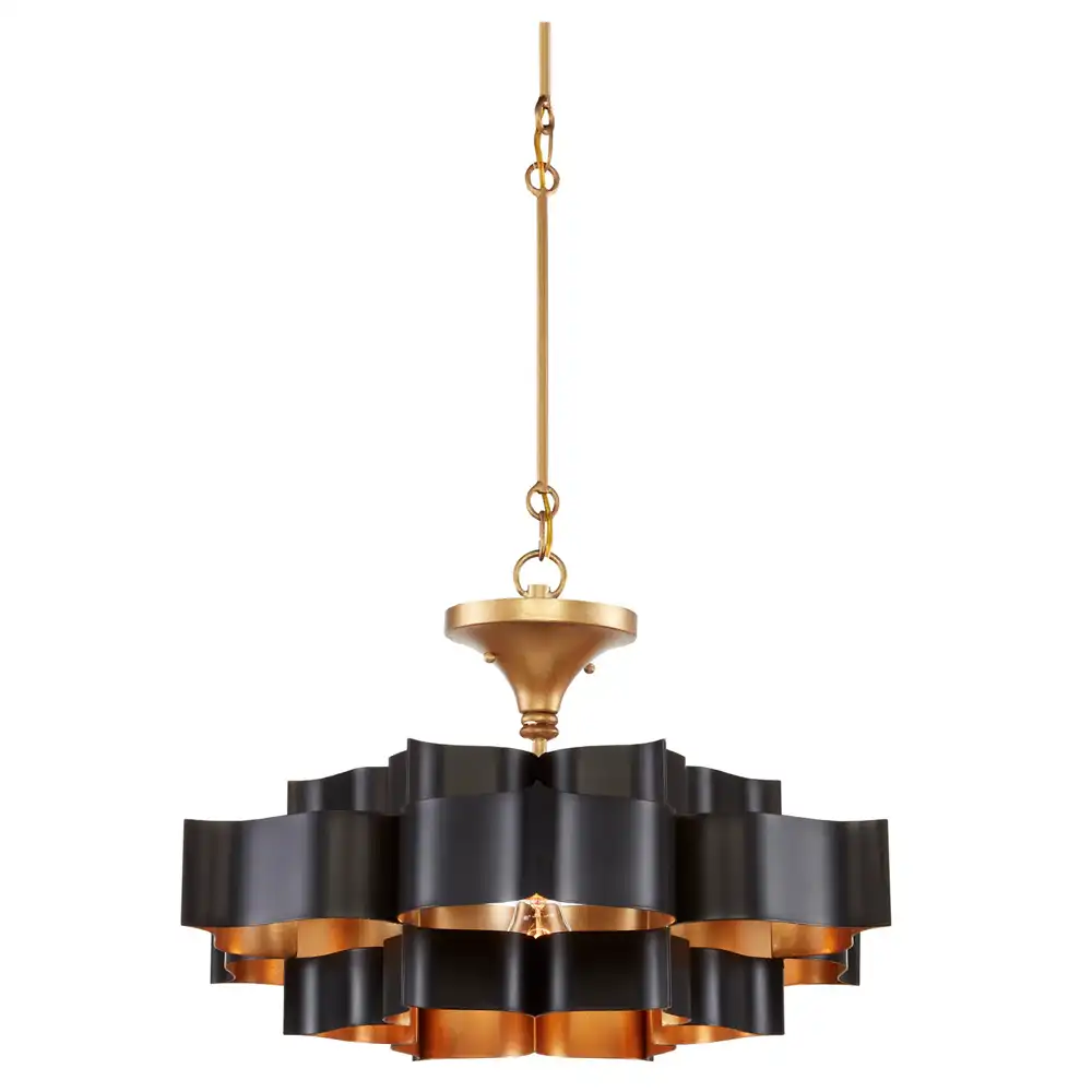 Suspended from a vertical stem, the fixture transitions into a circular canopy-style accent, held by two gold rings, which then supports a short rod that carries the lotus structure. Each outer surface of the lotus frames is finished in matte black, offering a powerful contrast against the luminous gold interior and structure.